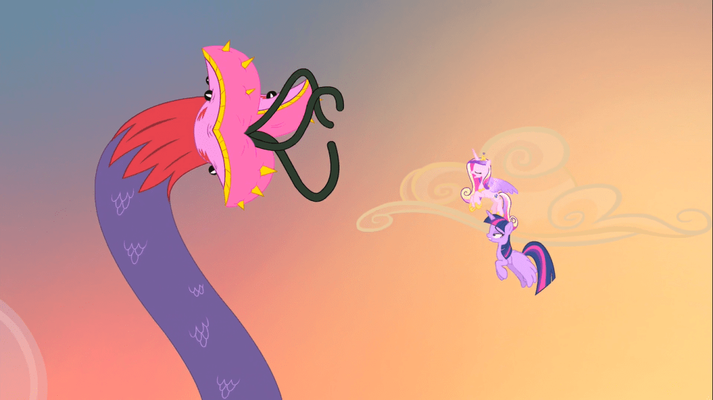 Twilight and Cadance climb up the hill to retrieve the surprisingly huge flower on top. This is where the action begins: first, they team up to pull the flower out of the ground, and then a huge worm comes out of the ground and attacks them. It’s wonderful seeing Cadance go on an adventure with one of the Mane 6 for a change, instead of just being a regular dutiful princess who shows up when characters visit the Crystal Empire.