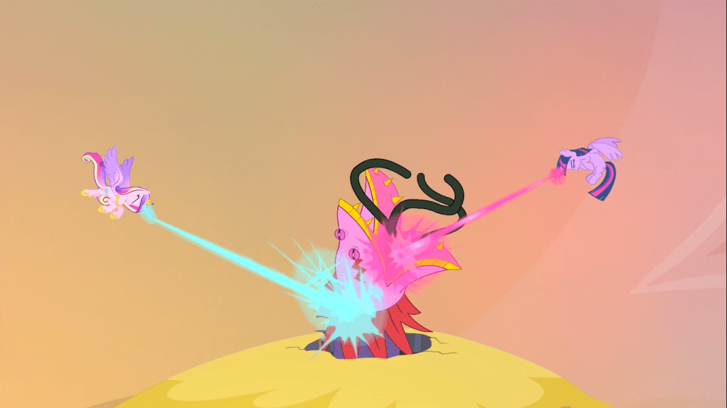 And the fight against the giant worm is where Twilight Sparkle and Cadance truly demonstrate their special bond. Each rescues the other from the worm’s tentacles using magic laser beams, then the two team up to seal the worm back underground, and Cadance covers the hole with some rocks. It’s awesome seeing these two take on a huge monster together, and we had never seen such strong fighting prowess out of Cadance before.