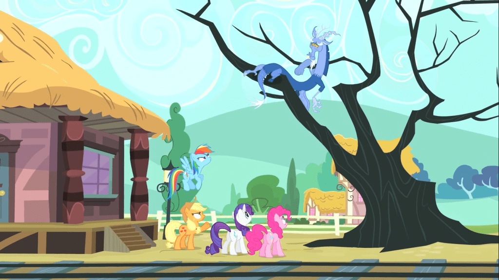This scene gives us a useful indirect moral that’s by no means the central focus of this episode: if you want to be friends with someone, it will help to provide some basic facts about yourself, like where you live. Discord doesn’t know this and doesn’t think it’s important, given that he interrupts Twilight Sparkle when she points that fact out, which shows that he still has a lot to learn about friendship.