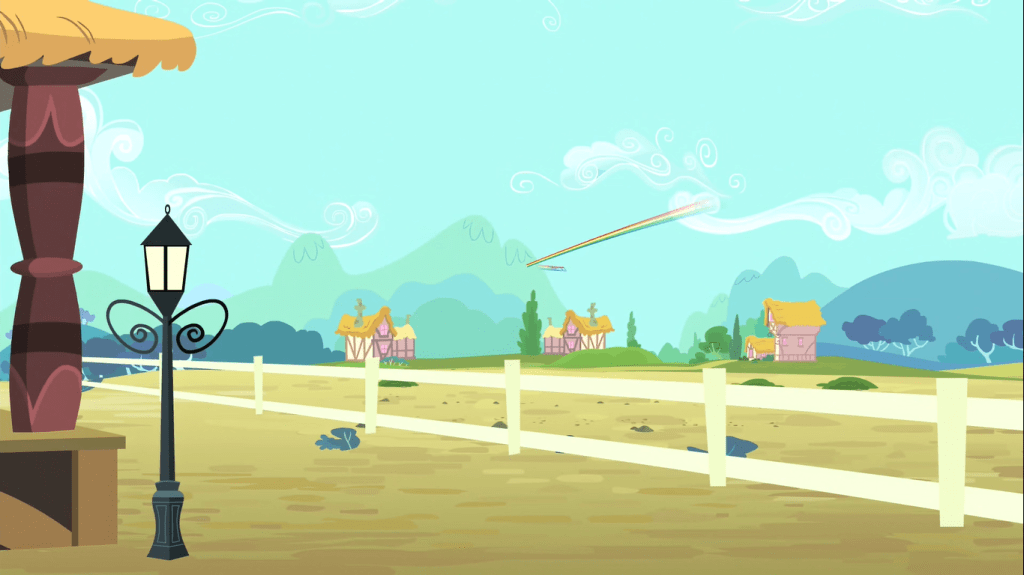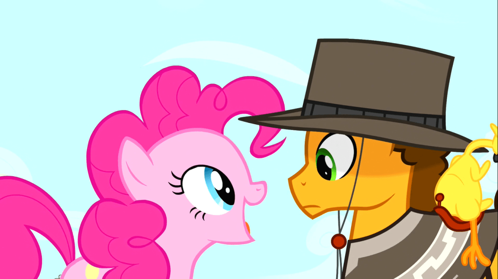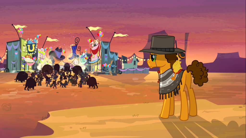 This episode starts with some familiar faces in Appleoosa having a party hosted by a much less familiar face. What’s weird about this opening shot is that while many locations in this show now use custom background pony designs befitting the place’s theme, like Canterlot or Manehattan, the background ponies in Appleoosa are just regular old background ponies with hats just like in Over a Barrel. It’s an oddity, but it does generally match the last time we were in Appleoosa.