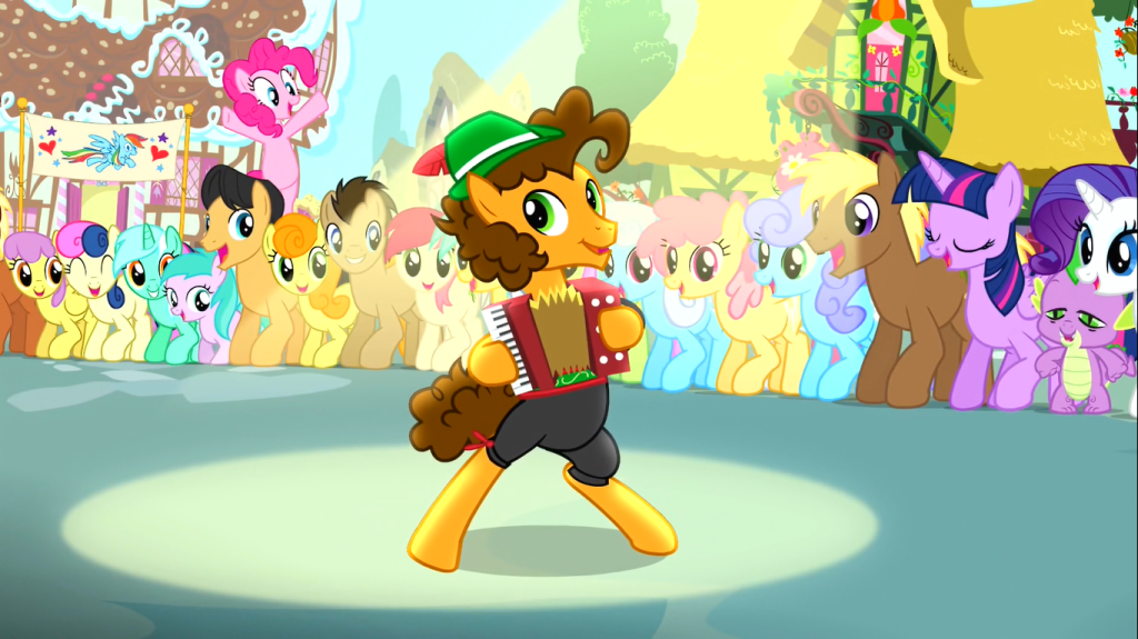 Cheese Sandwich then appears and gives Pinkie Pie an apology, saying that the real reason he came to Ponyville was to show Pinkie Pie how good of a party planner he has become. This leads to the episode’s fifth song, “Cheese Confesses”, where Cheese Sandwich reveals his surprising backstory.