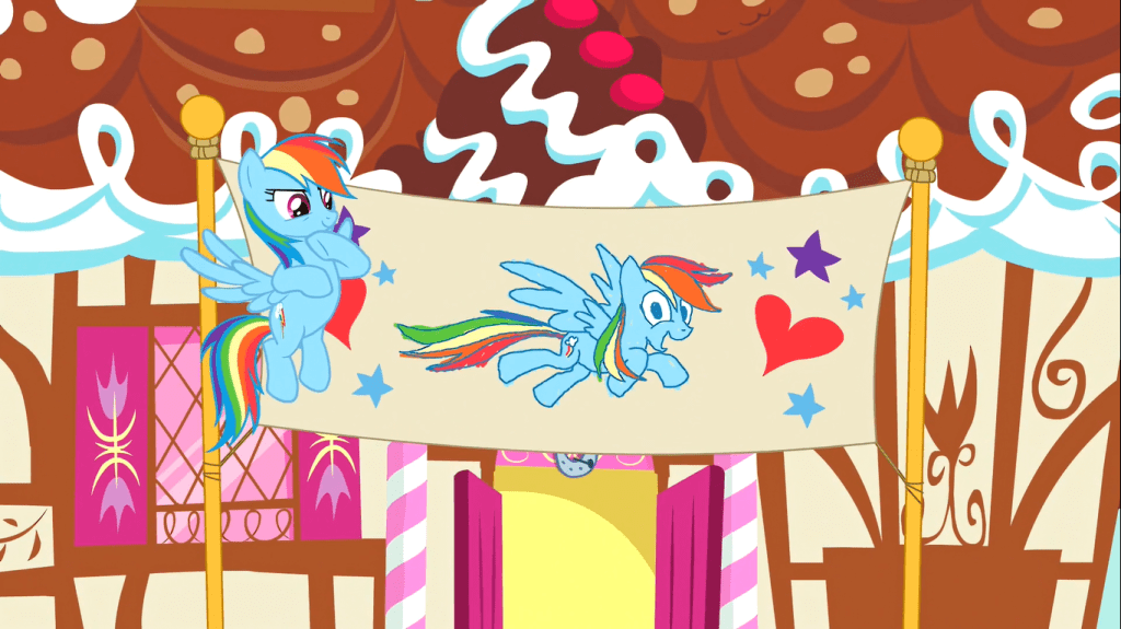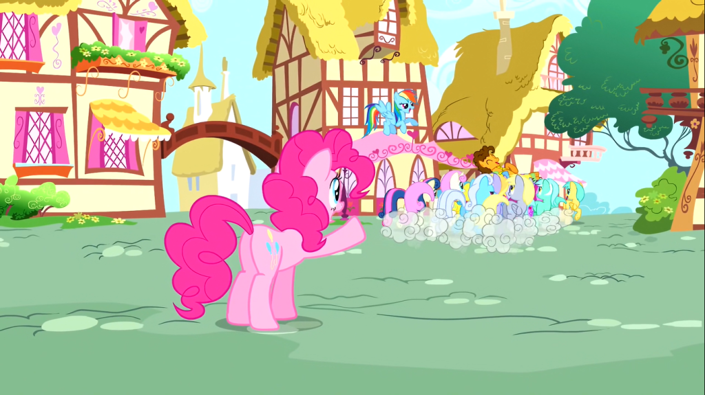 The first musical number ends with revealing the banner made for Rainbow Dash’s birthday party; a party that also happens to celebrate the anniversary of her moving to Ponyville, as she says later. Everyone in Ponyville is excited for this event, and Pinkie talks about how for her, party planning is extra serious business. Then, she meets face-to-face with Cheese Sandwich.