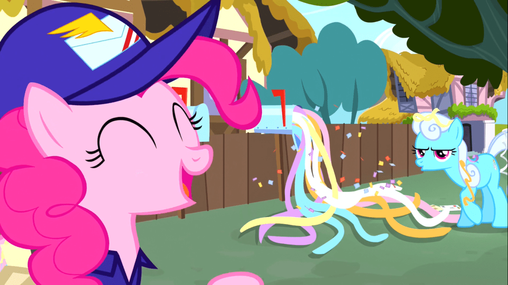 The third song is called “Pinkie’s Lament”, and it’s in an uneasy mix of major and minor key that indicates confused despair and mixed with hope Pinkie Pie is more cut out for a different profession. She tries various other jobs, like delivering mail as shown above, and they don’t work out since she keeps trying to mix them with balloons and confetti and other things she likes.