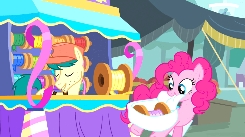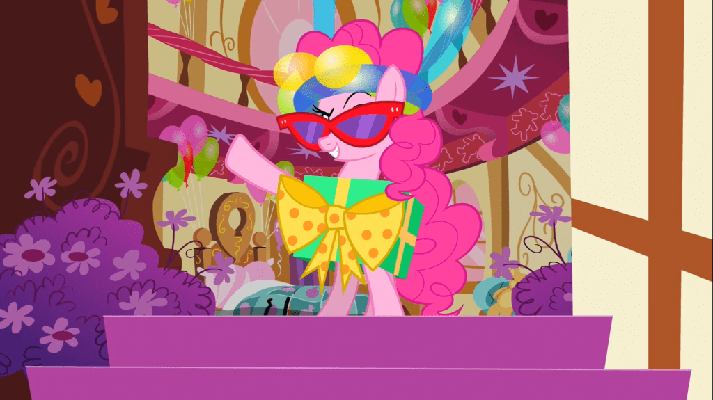 This song also comes with a nifty reminder that Pinkie Pie can bend the fabric of spacetime to her will. She shows this by stuffing a big streamer into her saddlebags, which either have a special property of shrinking items inside them or lead to a pocket dimension that would burn the eyes of any outsider if peeked at.