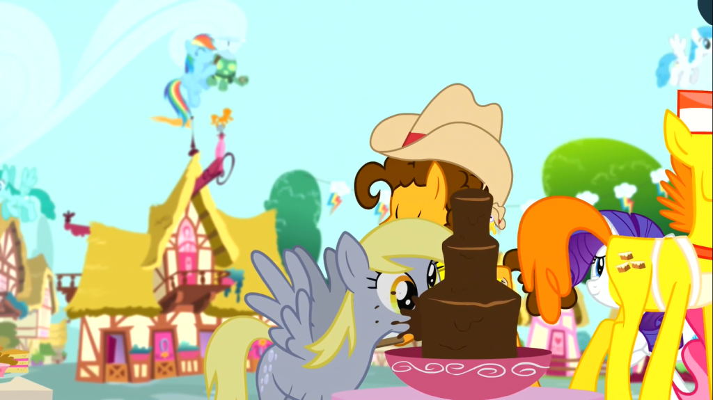 This episode has been generous with appearances of Derpy Hooves so far. Here, we see her sipping straight out of a chocolate fountain; could it be that she’s desperate to find even a single muffin in this huge birthday party and doesn’t like cupcakes anywhere near as much as muffins? Maybe her reason for sticking her head into the fountain is in the hopes that a delectable muffin is found inside. Maybe she resents that cupcakes are far more common in parties than muffins are, and she feels that muffins deserve some love too. She’s totally not being clumsy and goofy; that is not something Derpy is ever known to do.