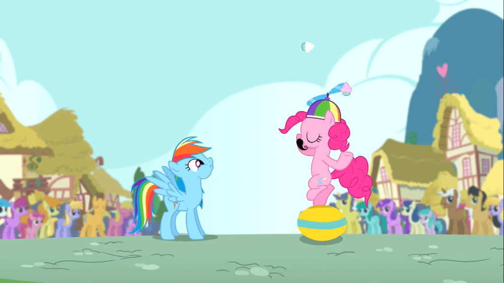 Pinkie Pie joins the scene and challenges Cheese Sandwich to a “goof-off”, a competition to determine who gets to host Rainbow Dash’s birthday party. Twilight Sparkle gets out a goof-off rulebook (which Rainbow Dash is surprised she has) and reads the guidelines.