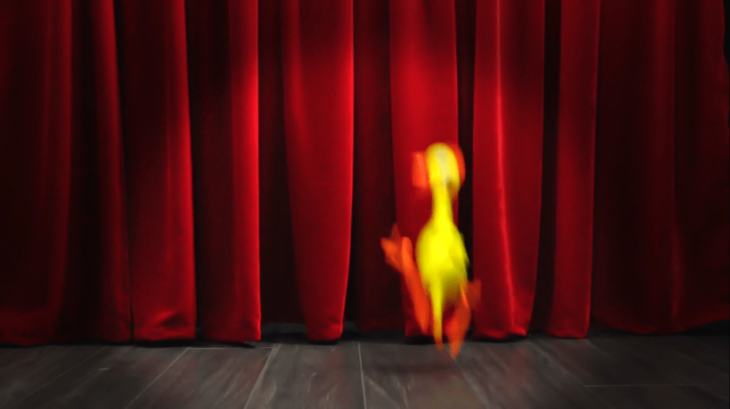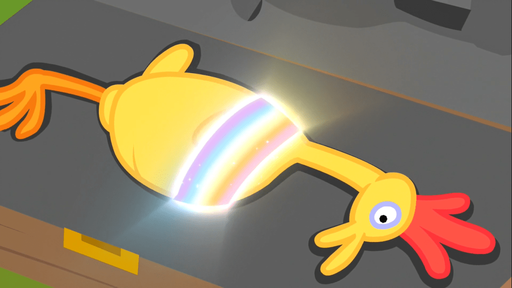 Boneless flashes with a rainbow, just like the gifts Rarity and Rainbow Dash got a few episodes prior. Cheese Sandwich then reveals that he has multiple copies of Boneless and goes off adventuring with Boneless number 2. Presumably, those are the same chicken dolls we saw Pinkie Pie juggling in the flashback.