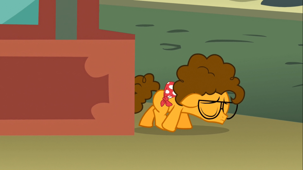 Cheese Sandwich reveals that he was very shy and lonely as a kid until one day, he stumbled upon a party that made him find his true calling. The image above shows quite a few well-known background ponies (and Cheerilee) as fillies, and it gives a nice picture of which background ponies at this point are still just generic background ponies, and which are considered proper parts of the show’s cast. As the number one most popular background pony, young Derpy Hooves’ presence is no surprise. Lyra and Bon Bon are shown to have been an inseparable duo since they were fillies, which is rather sweet. Minuette is shown as a filly too, and her popularity among fans is largely because her hair looks like toothpaste. There’s probably other popular background ponies seen as fillies here whose names I can’t remember. But then you still have some background ponies who seem to be the same age no matter the flashback, showing that season 4 still uses some generic background pony designs to fill space.