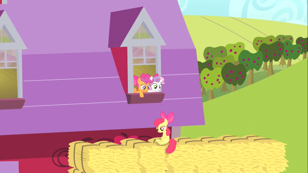 Apple Bloom sneaks out the window to get to the pie cart, but she lands on a big stack of hay arranged like stairs that Applejack put there. This is unintentionally genuinely helpful to Apple Bloom’s schemes, showing that having a big sister to look after her isn’t always bad. Just as long as that big sister knows her limits.