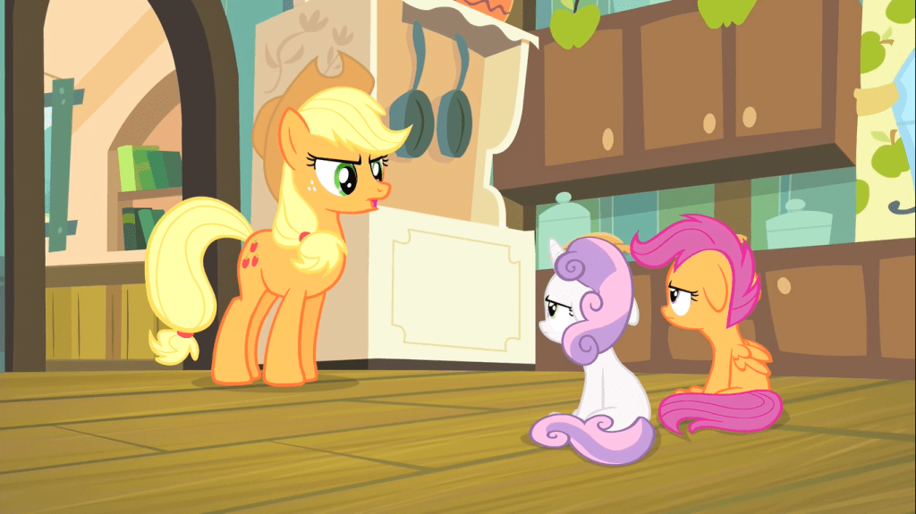 I feel like the excessiveness of Applejack’s behavior is mitigated a little bit by having Big Macintosh as a counterpoint: someone who feels she’s being ridiculous but doesn’t express his thoughts with enough words to get Applejack to reconsider. The line about getting a spoon out of a drawer is an extreme example of one of Applejack’s weirdest traits: her tendency to overthink everything, which momentarily causes her to think Apple Bloom is extremely stupid.