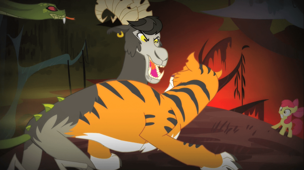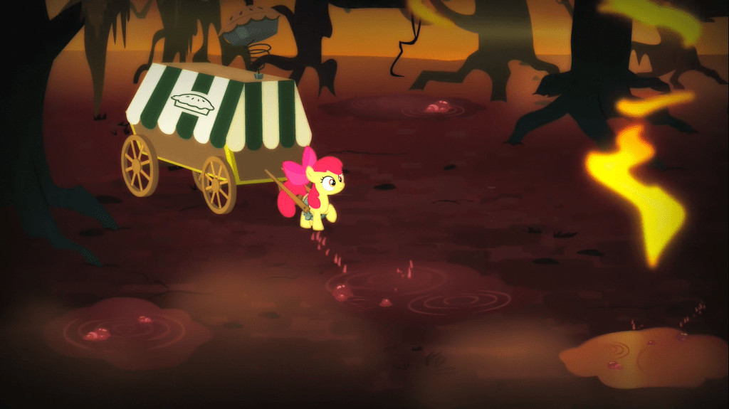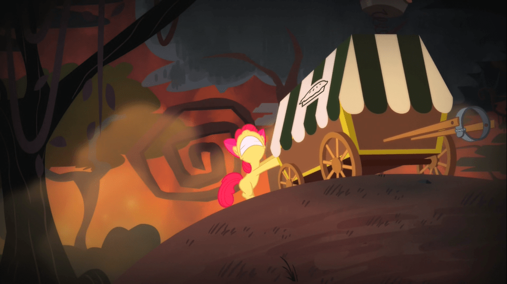 And the last third is where the episode starts going in surprising directions. A mundane episode about a kid being trusted to do things on her own has turned into an adventure where she traverses a deadly forest with flames that burn her map and then encounters a fierce creature. Apple Bloom got wrapped up in a tense adventure all by herself, making for an unexpected twist on a typical episode of a show where a kid struggles to gain their guardians’ trust.