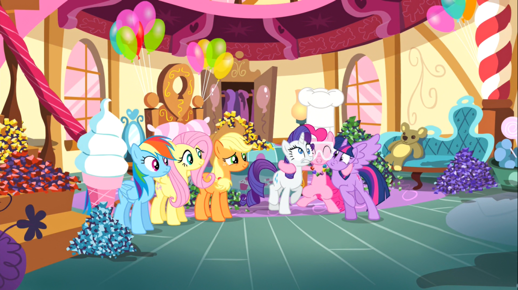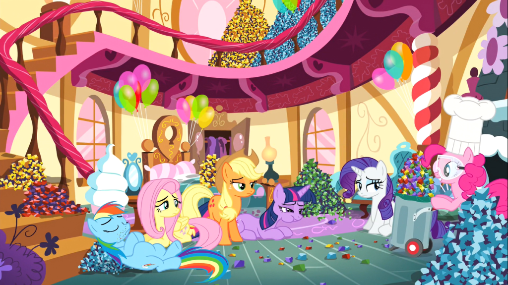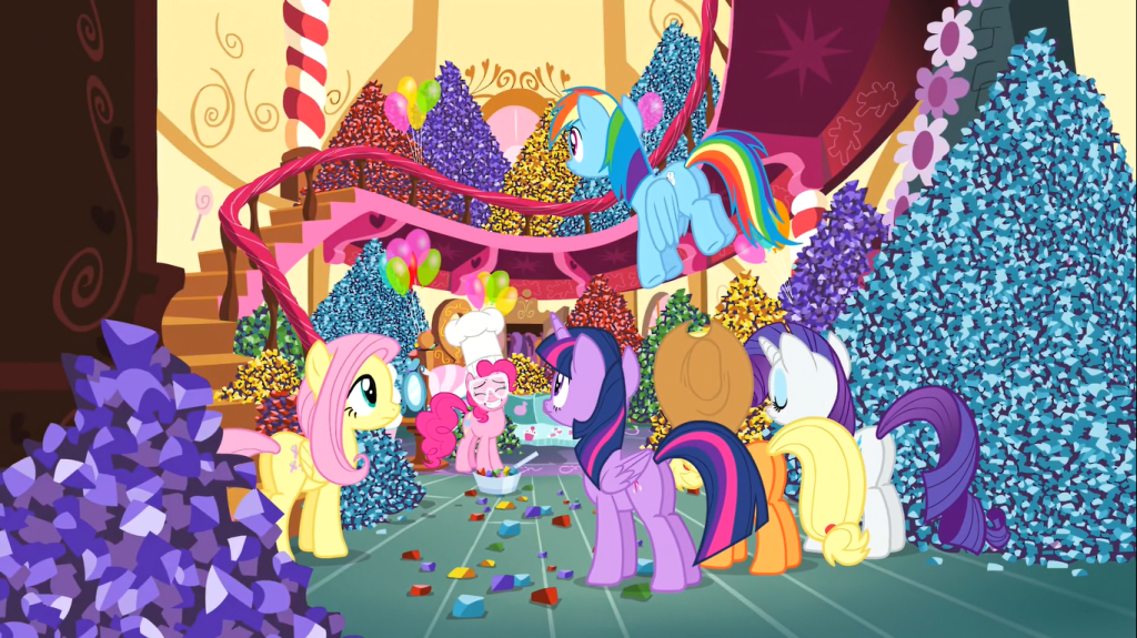 Pinkie Pie gets her friends to taste test all her flavors of candy, and they all feel sick when they’re only halfway through. If you watch this scene knowing what Maud Pie is like, this is a demonstration of Pinkie Pie’s insecure side. She will go to enormous lengths to please her sister because she often feels she isn’t good enough for Maud, or her acts of sisterly love could never compare to Maud’s. But such is why their sisterly relationship works: Pinkie Pie is extremely eager to please, and Maud Pie knows that Pinkie doesn’t have to do much to make her happy.