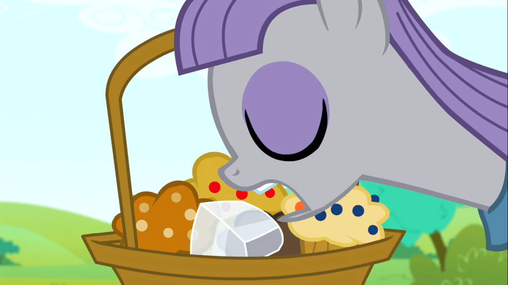 The humor and subversions of expectations continue when Applejack offers for Maud Pie to try one of Granny Smith’s muffins, but she eats the rock that fell out of Rarity’s hat instead. This girl masterfully blurs the line between intentionally and unintentionally being weird, and I love how the very notion of eating rocks makes absolutely no sense to anyone outside the Pie family. It’s completely nonsensical why some ponies would freely eat rocks while others don’t, but I can easily chalk it up to the rule of funny.