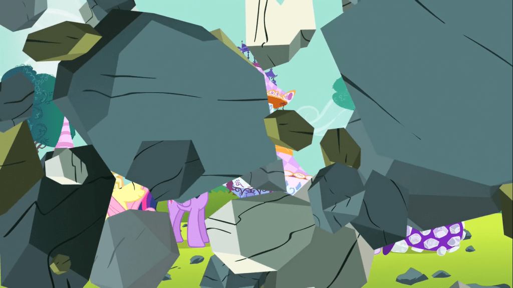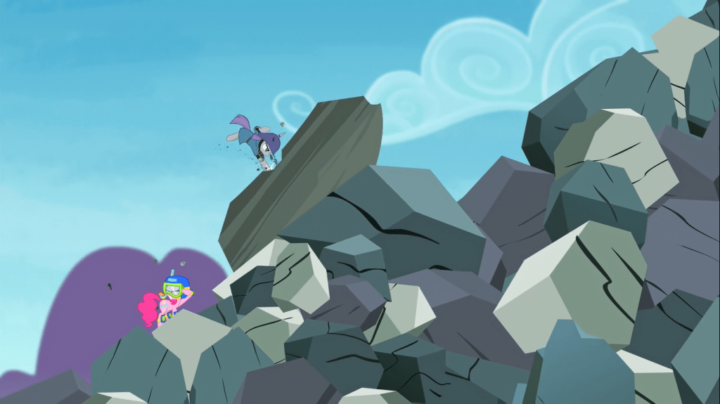 Pinkie Pie goes through the obstacle course as a demonstration, and she shows how little she thought of safety when she gets her hoof stuck in the last part of the course, which is a rock slide for Maud. A huge rock at the top of the hill comes tumbling down, one that’s probably too big for Rarity or Twilight to shatter apart with unicorn magic. With this life-threatening situation, who steps up and saves Pinkie Pie?