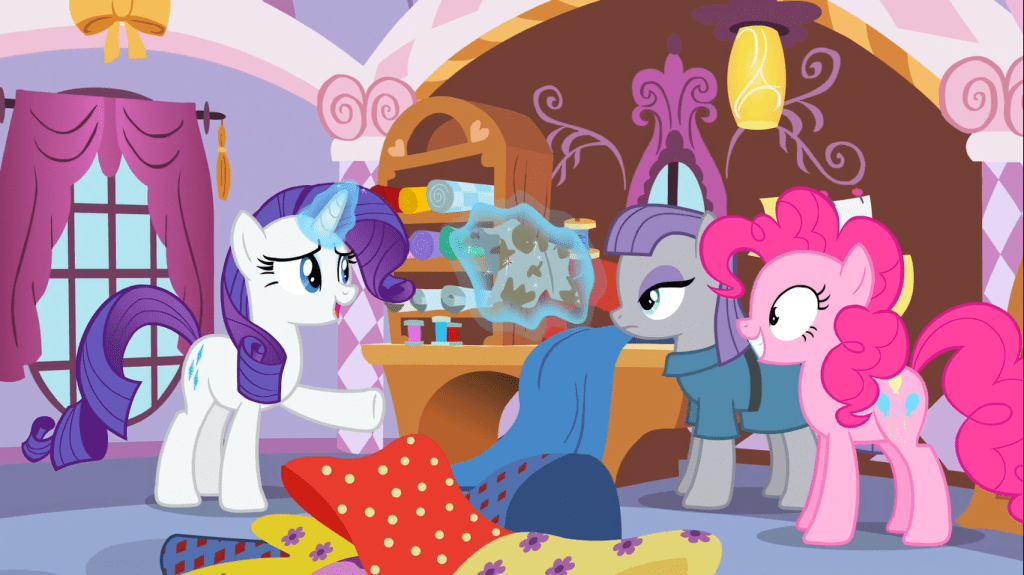 I can’t decide if Maud Pie is being literal-minded like Pinkie Pie when saying her dress doesn’t talk, or if she’s purposely screwing with Rarity here. Either way, lines like this that subvert expectations and send other ponies into incoherent stammering are part of what I love about Maud Pie.