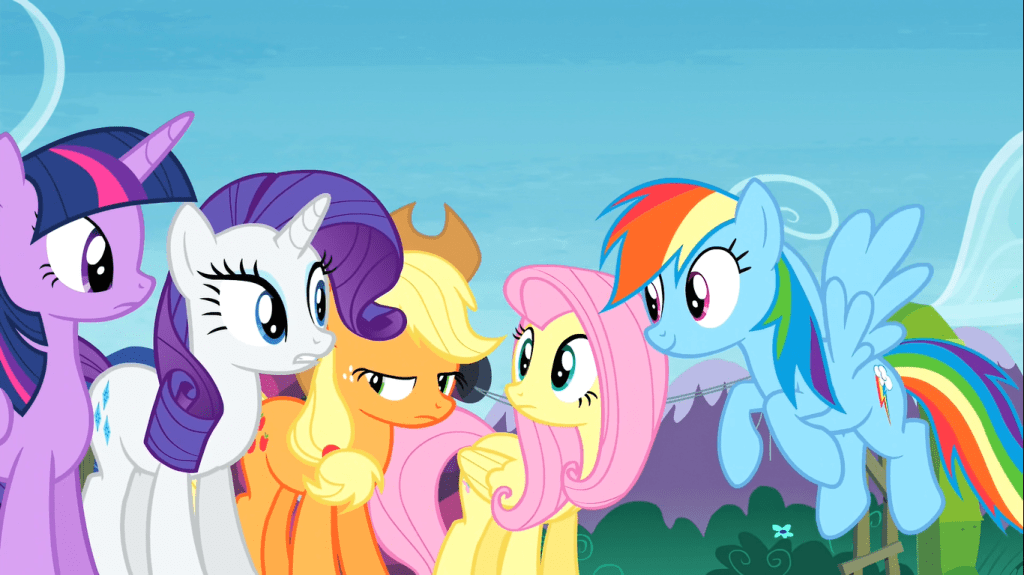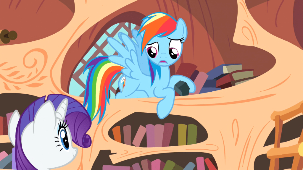 Does this six-second song Apple Bloom sings before getting interrupted even count as a musical number? It’s not listed in the episode’s credits, but I’m sure some fans have gotten into heated debates about how many musical numbers season 4 has because of whether this counts. Personally, I think the fun of counting many sorts of things, whether they be Super Mario games or dialects of a language or musical numbers in MLP, is debating over edge cases and things that maybe count. I will leave you to decide whether this counts as a musical number instead of weighing your opinion with a stance of my own, because I sure can’t decide.