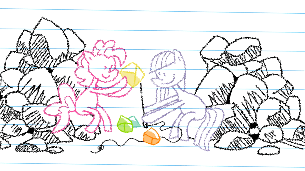 Pinkie Pie explains that the rock necklaces are not just for Maud Pie, but something that the two will do together with the Mane 6. She gives an exposition sequence about her family’s rock candy necklace tradition, done in an art style shift loosely reminiscent of the art style shift in A Friend in Deed. This time, the art style is sketchy drawings on notebook paper, and the drawings show Pinkie Pie and Maud Pie smiling equally; a demonstration of how Pinkie Pie sees their relationship, especially considering that Pinkie Pie drew these pictures herself. This makes it all the more shocking when we meet Maud Pie in person, but all the more heartwarming when we see firsthand how much they care about each other.