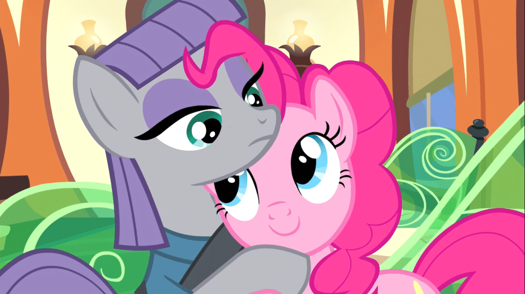 Here’s where it becomes clear how much Pinkie Pie looks up to her older sister, which is very sweet; also the first time it’s confirmed that Maud is the older sister. On the surface, it may seem like they have nothing in common, but their sharp contrast makes their similarities stand out. They both tend to be literal-minded and misunderstand social cues, they both have wacky senses of humor, and most of all, they share a deep, resounding love for their family. While Maud Pie stuck to her family’s long history of working with rocks, Pinkie Pie also participates in rock-related traditions because she loves spending time with her family.