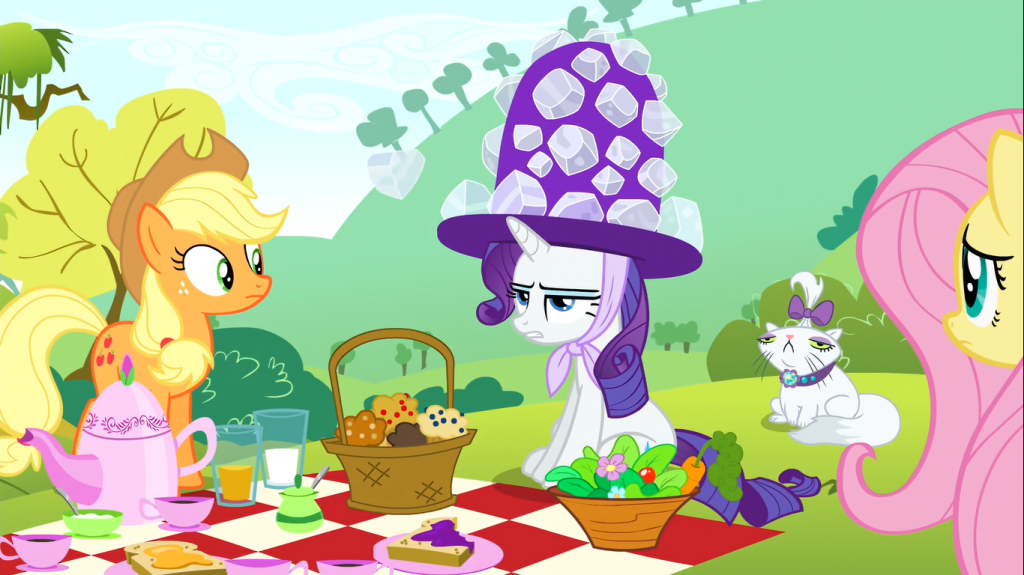 While Pinkie Pie leaves for the train station her sister will be arriving at, the rest of the Mane 6 set up a picnic and bring their pets. Rarity comes in wearing a hat decorated with rocks while complaining about how difficult it was to make and how the rocks keep falling off, even though no one told her to make a rock-themed hat. This is something she did completely on her own volition, since Pinkie Pie told her that Maud likes expressing herself through fashion, and Rarity took that statement extremely seriously. Rarity’s difficulty in making a comfortable outfit themed around rocks shows how bizarre Maud’s obsession with rocks is, though after the later episodes where Maud appears, I have become desensitized to it. Anyway, I think it says something that Rarity is the one who put the most work into preparing herself for Maud Pie’s visit. She will always do crazy things to please others, and she views Maud Pie as she would a fashion client of hers.
