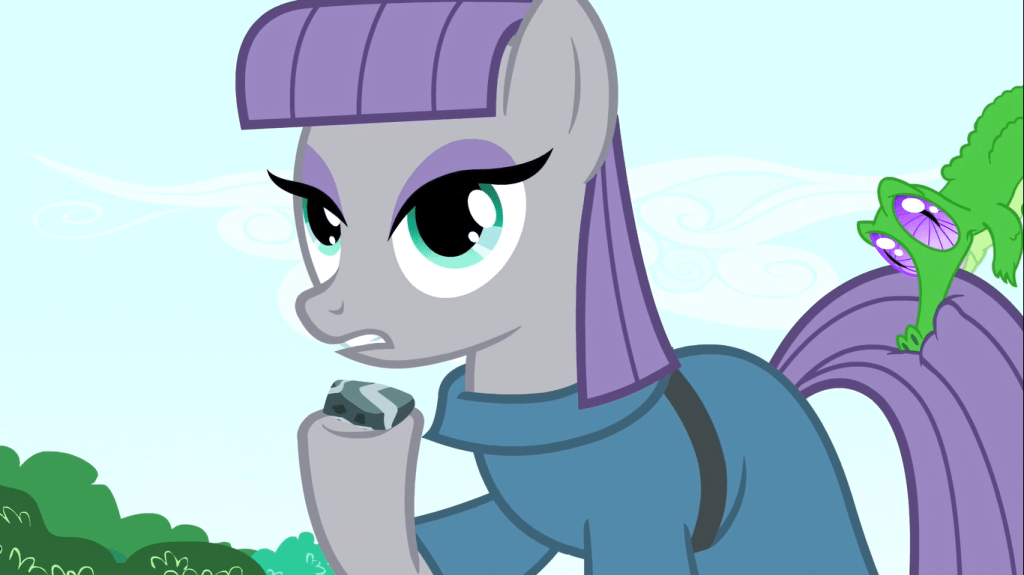 While hanging out with Fluttershy, Maud Pie pays no attention to the animals around her, instead fixating entirely on—you guessed it—rocks. She pays attention to and is intrigued by very different things from most ponies, and it’s clear that her brain in general works differently from most ponies. I hope it’s not weird that I’m starting to think Maud Pie may have autism or some related disorder, because she seriously shows a lot of signs. And if you think autism means nothing more than having low intelligence, please read up on the topic so that you can correct those annoying misconceptions. You might be surprised!