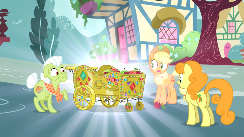 Now that I think of it, if Rarity had asked Applejack for permission to give all the carts a makeover, her spell would have been broken much more quickly, because the spell breaks when true words are spoken and you know how Applejack is with true words. Yes, it’s a common meme to say that Applejack isn’t really honest, but season 4 is where she starts being properly portrayed this way. Better late than never!