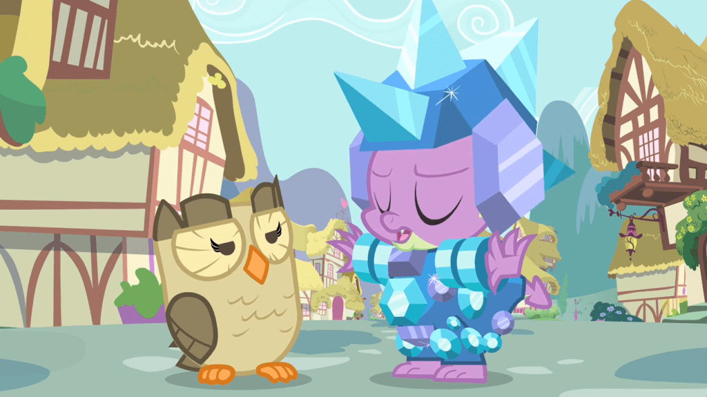 The first interesting thing that happens here is the reveal that in the Crystal Empire, Spike is universally known as “Great and Honorable Spike the Brave and Glorious” because of the crucial part he played in saving the empire. This running joke doesn’t take long to get old, but it does indicate the deep, earnest importance the residents of the Crystal Empire place in both their fabled heroes and their fearsome villains like King Sombra. Another interesting thing to note is that Cadance mentions Spike will be the first dragon to light the torch at the Equestria Games, which demonstrates how distant the cultures of dragons and ponies normally are. Spike is a major anomaly among dragons in terms of upbringing, and we’ve seen that most dragons barely know anything about ponies. I wonder if a griffon has ever been selected to light the torch? It would be plausible considering that they also participate in the Equestria Games, matching their competitive nature.