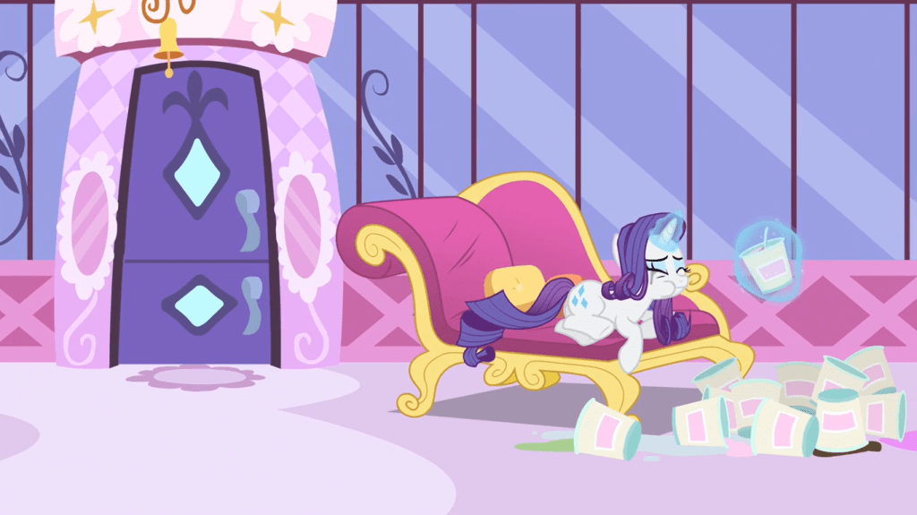 Here’s the point where Rarity definitely stops feeling like Rarity. In Sweet and Elite, she nervously took a bite of this stereotypical fancy food and even dipped it in chocolate hoping it would taste better only to spit it out anyway; I remember this because I analyzed that scene in needless amounts of detail. But here, she is overhauling a kids’ birthday party by replacing all the cake and candy with that very same style of “fancy food”. This is this episode’s main issue: after a certain point, Rarity stops feeling at all like her regular self.