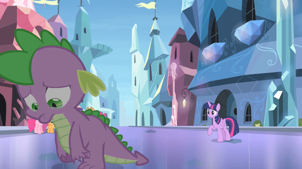 What’s addressed in this episode is Spike’s insecurities about being in a high-up role, which he seems to have in common with Twilight Sparkle. While Twilight has struggled with being seen as big and important throughout this season, only now does Spike find himself in a similar situation. He normally enjoys getting attention and praise, but not to a degree like this. Being held in such absurdly high regard is so foreign to him, and he doesn’t have an authority figure like Celestia to reassure him. Twilight Sparkle probably thinks he’s perfectly fine with being seen as so important.