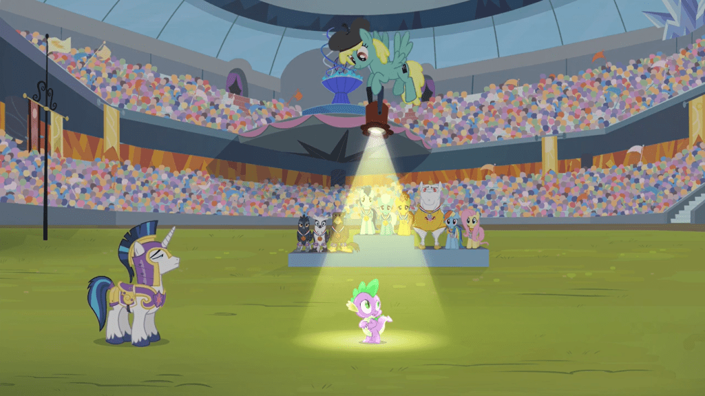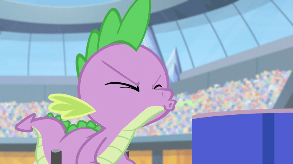 Spike asks Ms. Harshwhinny for something new to do at the Equestria Games, almost explaining that he wasn’t the one who lit the torch before Harshwhinny interrupts him and thinks he’s just desperate for attention. He’s actually desperate to have a personal moment of fulfillment, which he almost gets when he thinks he’s about to sing the Ponyville anthem word-for-word…