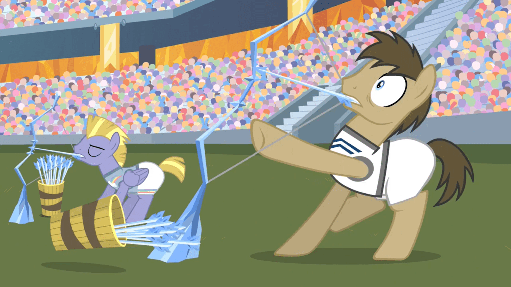 Shining Armor reveals the final event of the Equestria Games to be ice archery. In this game, the arrows freeze whatever part of the target they hit, and the first person to cover their entire target in ice wins. I must say, this episode is really going out of its way to devise a scenario where Spike can do something cool and heroic, which as I’ve said is a common Spike episode problem.