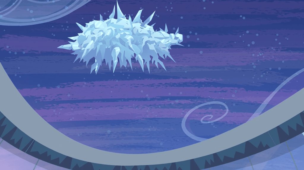 One of the athletes slips and accidentally fires an arrow straight at a cloud. Somehow, the arrow froze not just a small portion of the cloud like it did with the targets, but rather the entire cloud. The icy cloud descends onto the arena, leaving everyone in peril since the unicorns’ magic was disabled. I have to wonder whether the unicorn magic disabling device has been used every Equestria Games or not, and if so, how prior hazards have been dealt with… oh wait, I briefly forgot it’s called the Spike Episode Plot Device and only exists in Spike episodes.