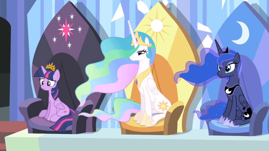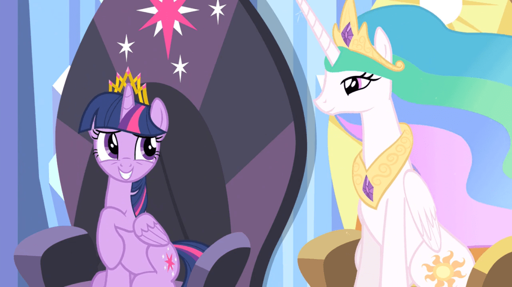 Twilight Sparkle loudly cheers for her friends, then awkwardly smiles to Celestia, who nods in response as if to tell her it’s OK to be excited. Another wordless demonstration of how insecure she feels about being a princess, something that’s lightly shown here and fully addressed in this season’s incredible finale.