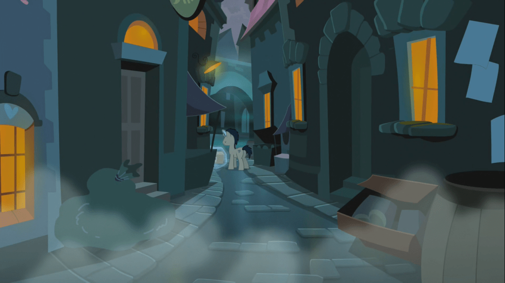 To convey that Tirek and Twilight Sparkle are evenly matched now, both of them smash doors: Tirek on the way to try to absorb the princess’s magic, and Twilight Sparkle by mistake when exiting her house. Twilight Sparkle’s clumsy shenanigans with her powers are stunning to watch, and they leave me internally screaming “be careful!” She clumsily tries to hide her new powers from her friends, then goes to the Everfree Forest while telling her friends to keep everyone in Ponyville indoors.