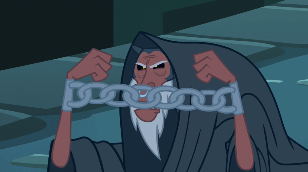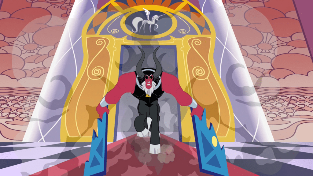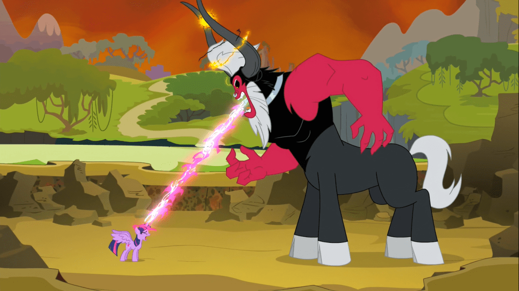 After absorbing magic from unicorns, Tirek absorbs the flight from pegasi and the strength from earth ponies with Discord’s help. While purported to be “freed” from the clutches of friendship, Discord has fallen for illusions of friendship with Tirek—someone who loves being almighty and powerful just like him. Tirek is a truly monstrous villain, and he’s one of the most well-liked villains of the show. It probably helps that he originated from 80’s MLP and hadn’t appeared since then.