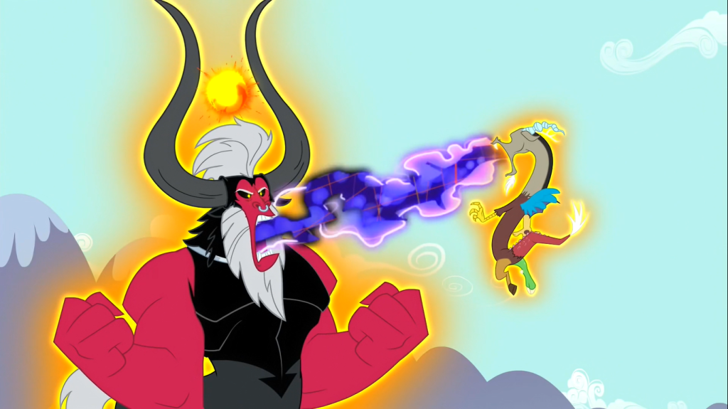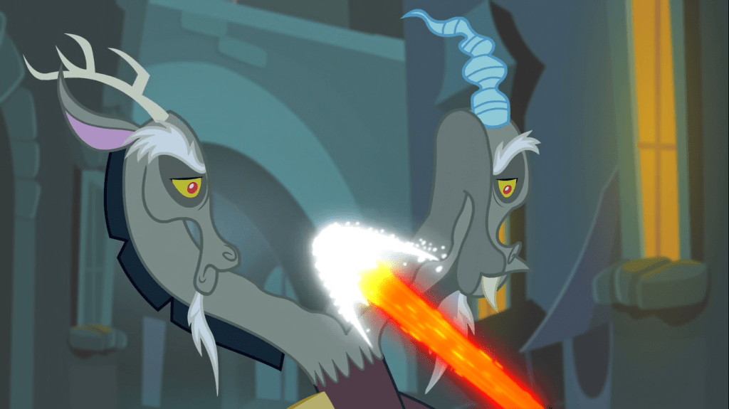 Discord proves himself a worthy rival to Tirek and ally to our heroes when he handcuffs the guy with a snap of his fingers, then avoids a laser beam from Tirek by briefly splitting his head in half.