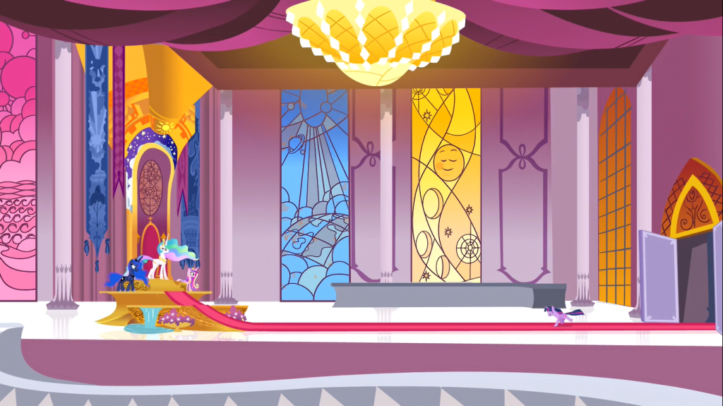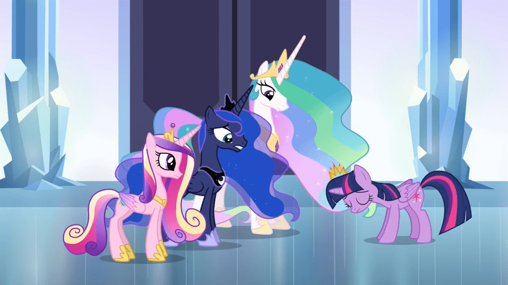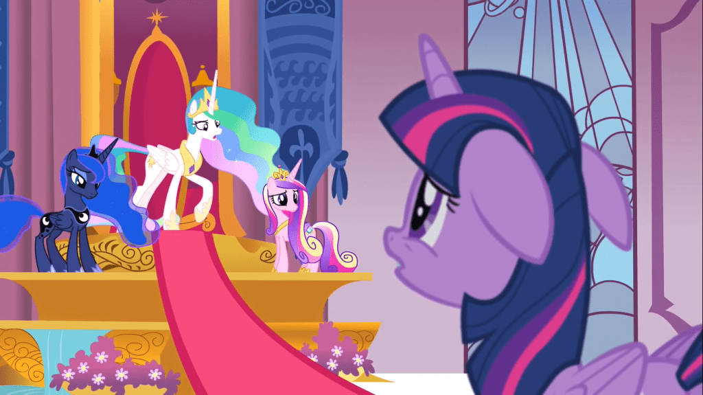 After learning the meet-and-greet event is over, Twilight Sparkle meets with the other three princesses who all politely tell her that having all four princesses aboard confirms to the guests that their visit is considered important. Much like the rest of the Mane 6, her fellow princesses all politely try to reassure her in a way that doesn’t get through to her; only her lifelong sidekick Spike freely admitted how strange it is that she did so little. Though she treats Celestia, Luna, and Cadance all with massive respect, she feels very disappointed that she has had so little to do as a princess.