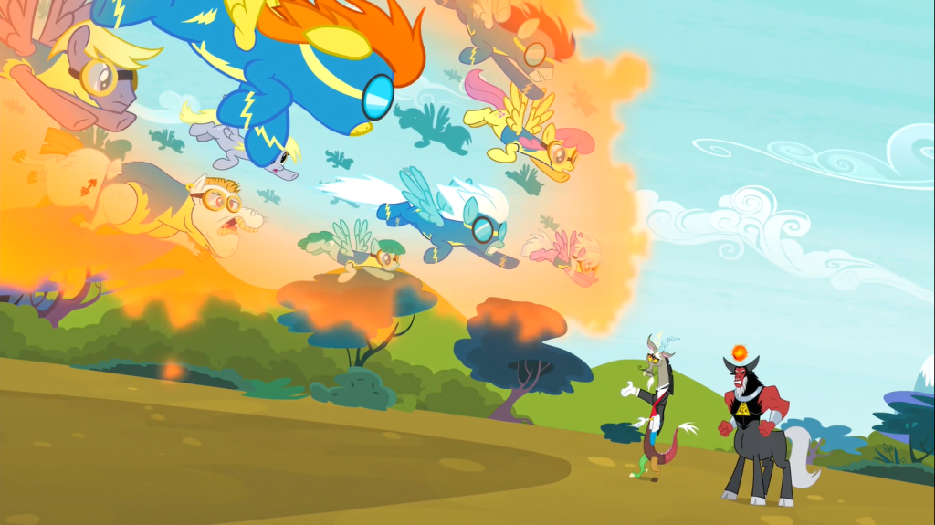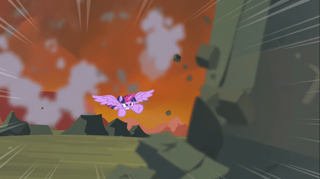 Just look at Twilight Sparkle blasting her way through giant rocks after Tirek slammed her into a mountain. And the explosion at the end, which is just one of many in this battle. This whole battle blew my mind the first time I watched it like few works of media have ever done. If I was told about all this a day before I watched MLP:FiM for the first time, I would have thought it was a joke. (Then again, when I first watched the show, this episode hadn’t come out yet.)
