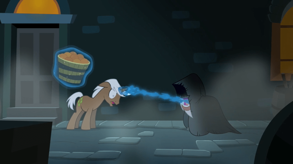 Once the musical number ends, things start to get terrifying. Scored with tense, uneasy music, a new villain named Lord Tirek makes his debut. The very first thing he does is suck all the magic out of a random unicorn and wash away his cutie mark, leaving the guy unconscious and allowing himself to gain more power. Every two-part episode villain so far has been scarier than the last—in the season finales especially, this show has a pattern of outdoing itself.