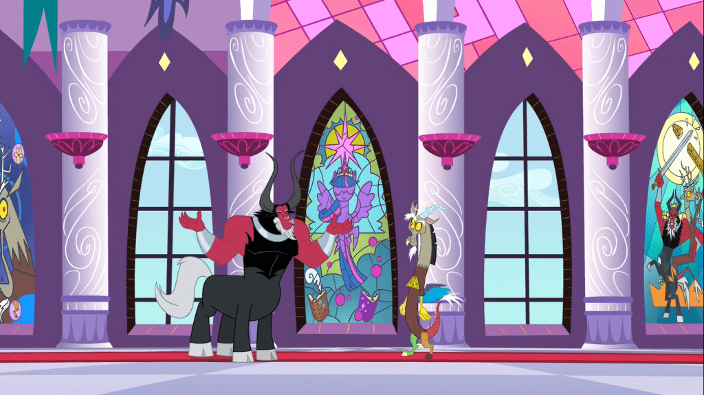 After giving Discord a medallion that supposedly represents his gratitude—a gesture of pseudo-friendship on his end—Tirek learns through stained glass paintings that there is a fourth alicorn princess. He’s briefly angry that Discord withheld it from him, but not for long. After Discord provides a little bit more information, namely that Twilight Sparkle lives in a library instead of a castle, Tirek sets out to find her.