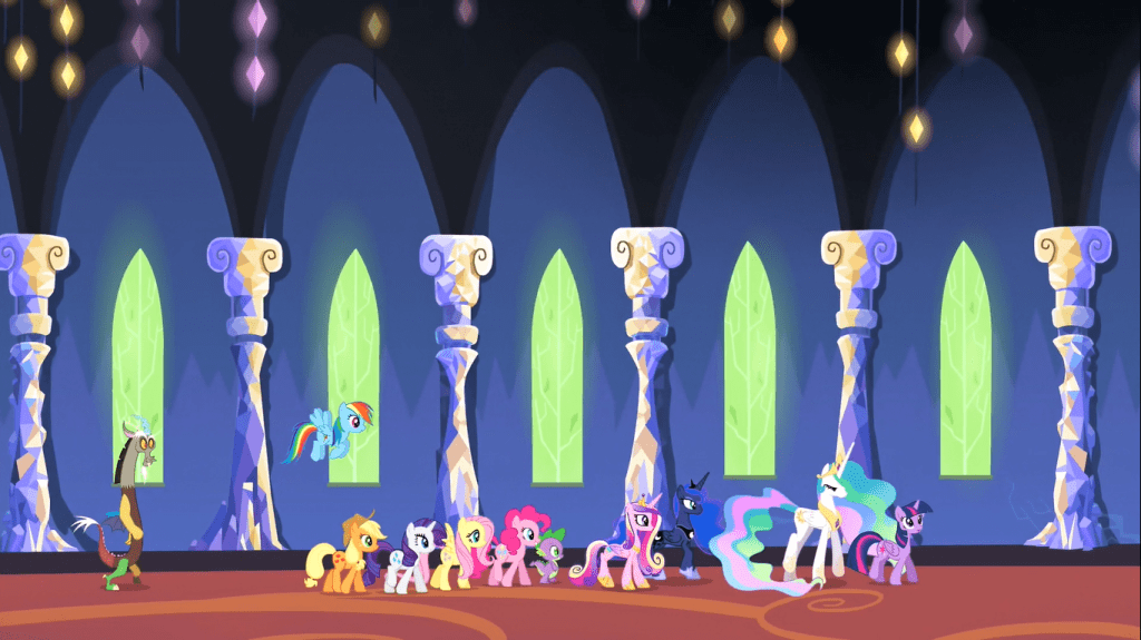 The Mane 6, Spike, and Discord have a group hug, and Discord is amusingly jealous that he doesn’t get a throne; Fluttershy politely tells him he’s not there yet. She’s willing as ever to forgive Discord while understanding he still has lessons to learn.