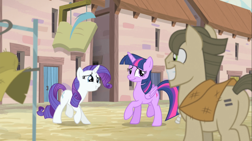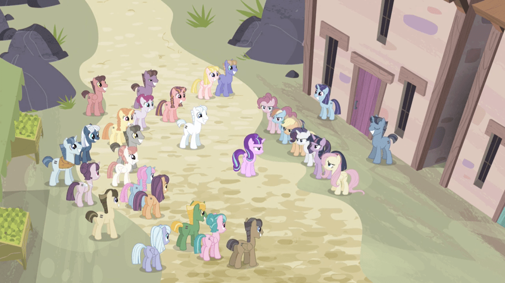 Double Diamond reveals the name of the leader of the town: Starlight Glimmer. Now if you don’t mind, here’s a problem with the existence of Equestria Girls. I feel like the reveal of Starlight Glimmer’s name is supposed to make viewers think, “hey, this name sounds an awful lot like Twilight Sparkle.” But since Equestria Girls happened, first-time viewers when the episode came out were probably more likely to think the name sounds like Sunset Shimmer, which it is indeed closer to. While Starlight Glimmer and Sunset Shimmer have obvious commonalities, I think Starlight Glimmer’s name is far more emblematic of her contrast with Twilight Sparkle. Both of them grew up as purple unicorns skilled in magic without very many friends: Twilight Sparkle had Spike growing up, Starlight Glimmer had Sunburst, and that’s about it. But while Twilight was raised under Celestia’s wing and became a beloved superstar alicorn princess, Starlight got caught up in petty jealousy and became a fearsome monster who brainwashed an entire town. I think this contrast is extremely interesting, but alas, since Equestria Girls happened, Starlight Glimmer is instead compared to, and often even conflated with, Sunset Shimmer.