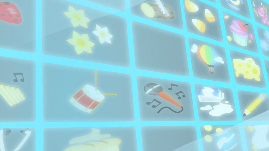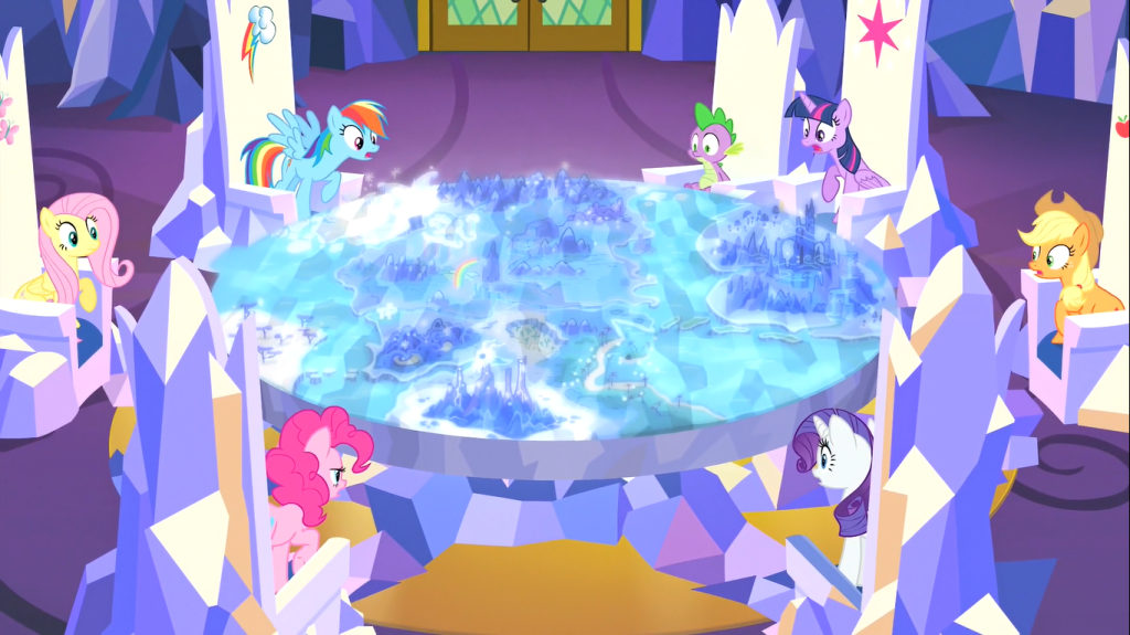 When the Mane 6 all sit on their chairs, a three-dimensional depiction of Equestria called the Cutie Map bursts out of the floor. We’ll be seeing this map a lot from now on, and its purpose is to direct the Mane 6 (and sometimes other characters) to locations where they need to solve friendship problems. It serves as a handy excuse for them to explore Equestria due to plot lore, giving episodes more time to explore the friendship problems themselves.
