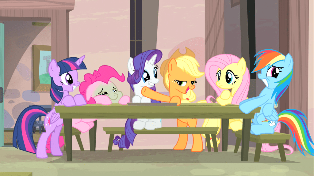 The Mane 6 gather at a table together and debate over why the map sent them here and how politely they should behave. Their argument doesn’t even get that bad, but a resident of Our Town named Sugar Belle breaks from her eternal creepy smile because she’s worried about the Mane 6, and she asks them if their friendship is ending. Sugar Belle is portrayed as an especially kind-hearted type after her cutie mark is restored, and she lets enough of that trait slip through the course of this episode to allow the Mane 6 to succeed. She presents a menu to the Mane 6, which consists of only one item: muffins. If no one in Our Town ever disagrees on anything, what’s the use of having multiple options in a bakery menu? The Mane 6 order twelve muffins.