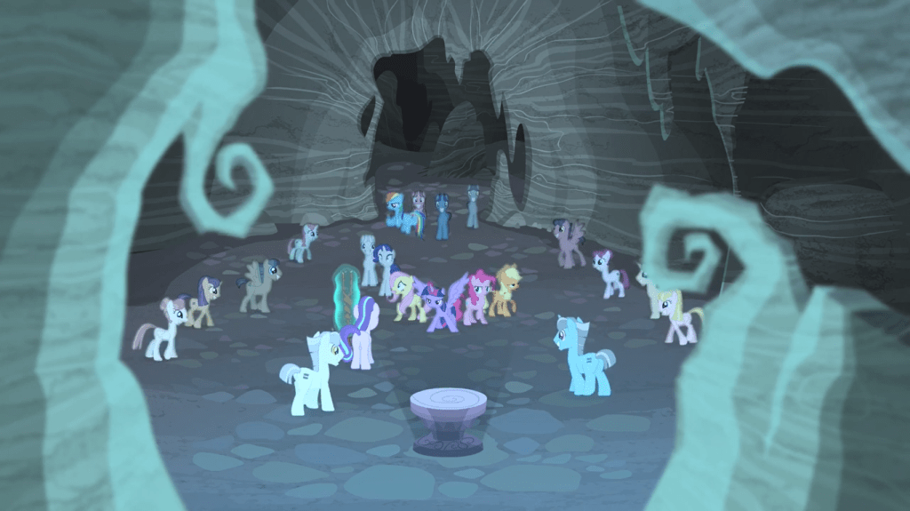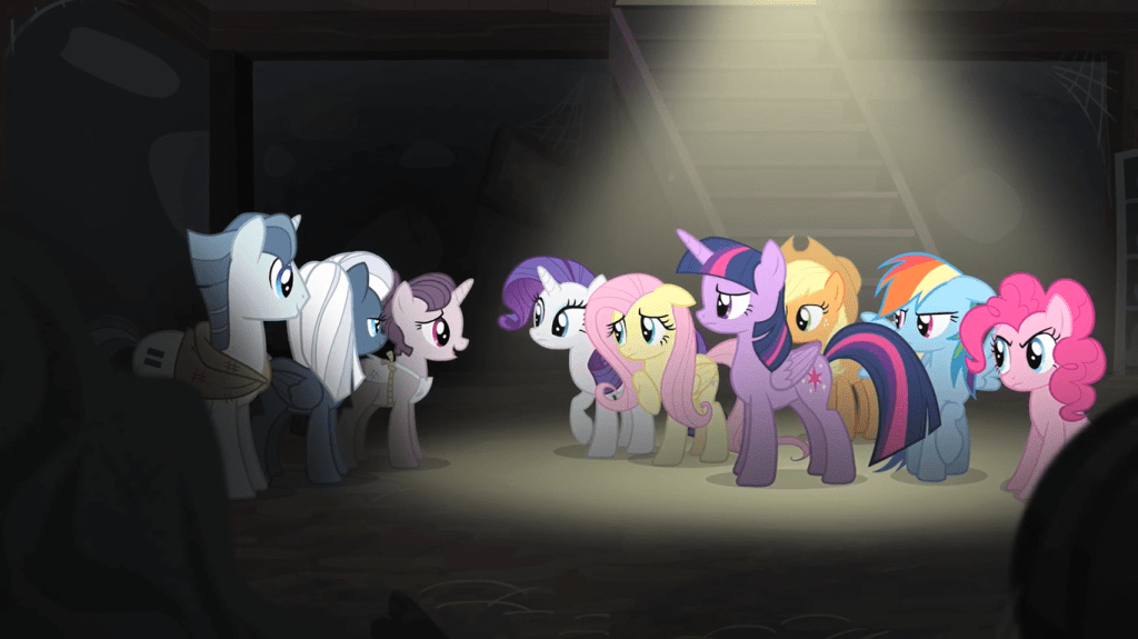 The Mane 6 land in Sugar Belle’s basement, where she and two other equal ponies talk about the prospect of getting their cutie marks back, which is something Starlight Glimmer strictly forbids in villainous dictator fashion. Though they all would love to have their special talents back, their extreme degree of brainwashing is demonstrated when one pony (the dark blue one on the left) claims the cutie un-marking to be a “beautiful experience” that is done using a magical staff. She then says that Starlight Glimmer allows them to visit the vault containing their cutie marks anytime they want. Such acts of pseudo-generosity are exactly the sort of things the leader of a cult would do to keep the cult members from rebelling. Cults are a terrifying concept to me, but there are times when I can’t help but laugh at how ridiculous they are. What’s-her-name’s “beautiful experience” line is one such example.
