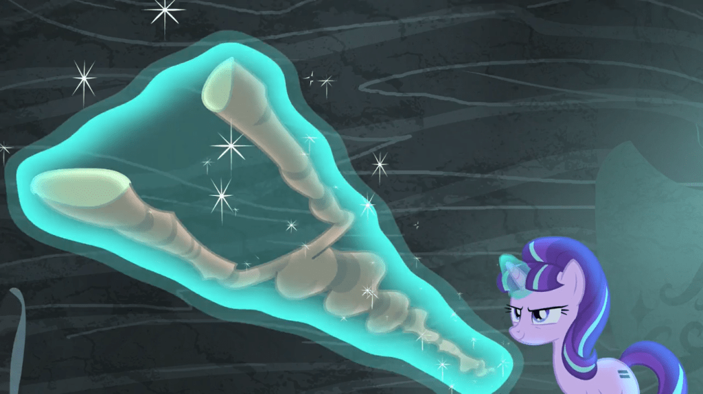 Now that they have some privacy, Twilight Sparkle brings up something fishy about Starlight Glimmer’s staff: according to her memory, Mage Meadowbrook had only eight historical artifacts, and none of them was a staff. She remembers just enough Equestrian history through the course of this brainwashing to bring up a hint that Starlight Glimmer may be hiding something, which eventually leads Fluttershy to investigate further and discover the truth.