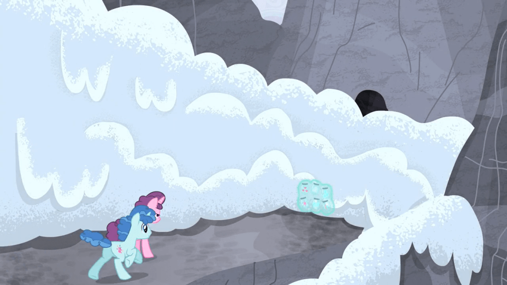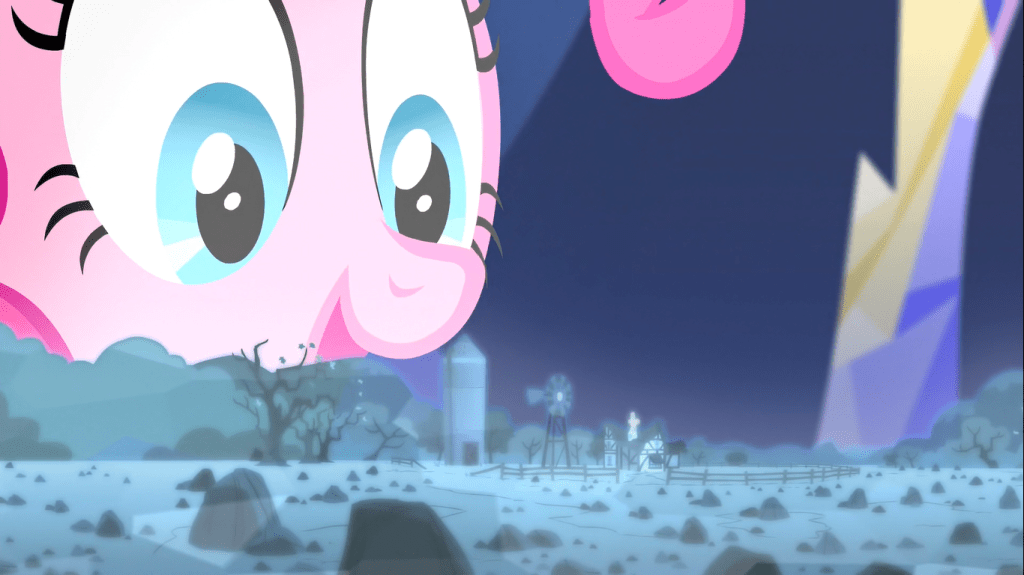 The others in the room give Pinkie Pie a look of surprise (shown above) in response to this line. Pinkie Pie sounded a lot like Maud Pie both in literal-mindedness and intonation, and with her characteristic lighthearted joy washed away from her, she’s not so different from her sister after all. It sort of reminds me of that one timeline in The Cutie Re-Mark where Pinkie and Maud Pie drilled apart a rock together, both with serious expressions.