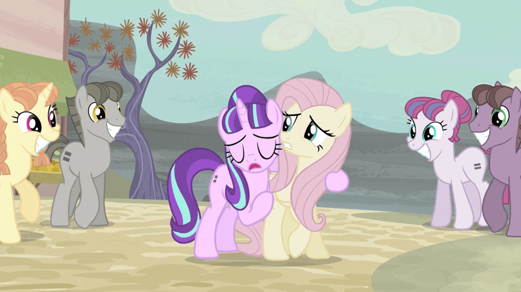 The residents of Our Town feel betrayed in response to this reveal, and Starlight Glimmer’s confident leaderly image shatters like an expensive wine glass dropped out the window of a ten-story building. She stammers and tries to cover her cutie mark with her tail, but it’s no use. Fluttershy saw firsthand how clumsy Starlight Glimmer can be when she lets her guard down, and she took full advantage of this.