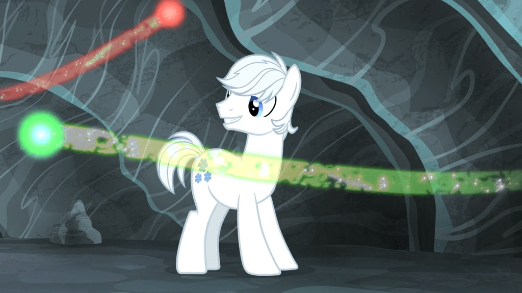 I find it incredibly poetic that the cutie mark vault is shattered using the very same piece of wood that Starlight Glimmer pretended to use to take away all the cutie marks. While the “Staff of Sameness” was total bogus, it did play a role in the expansion of Starlight’s cult since it was touted as such an important part of her mythology. And now it’s being used for a non-illusory purpose by Double Diamond, the very same pony who until now was Starlight’s loyal second-in-command.