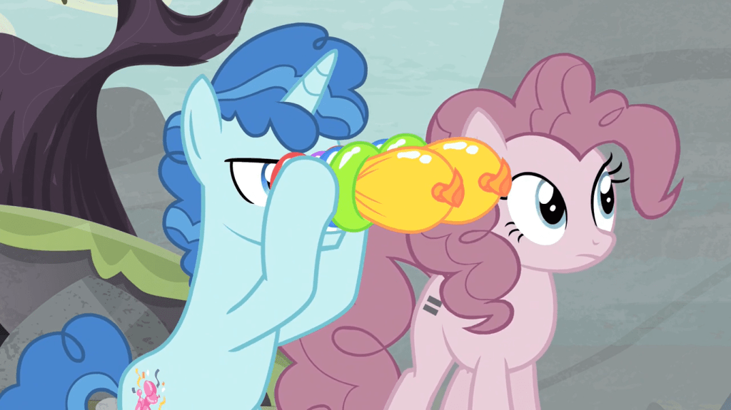 Party Favor, for example, is quite a fun one. His name suggested he might have abilities in common with Pinkie Pie, and he does not disappoint. He pulls a balloon out of thin air and twists it along with more balloons to create binoculars, which makes about as little logical sense as half the things Pinkie Pie does. I wonder if Party Favor came from a family who performs a comically boring activity like Pinkie Pie’s family… stick farming, perhaps? Maybe he’s related to Mudbriar (a character who doesn’t exist yet) and is the odd one out in their family? See, now I am getting carried away in speculating about these new characters’ backstories.