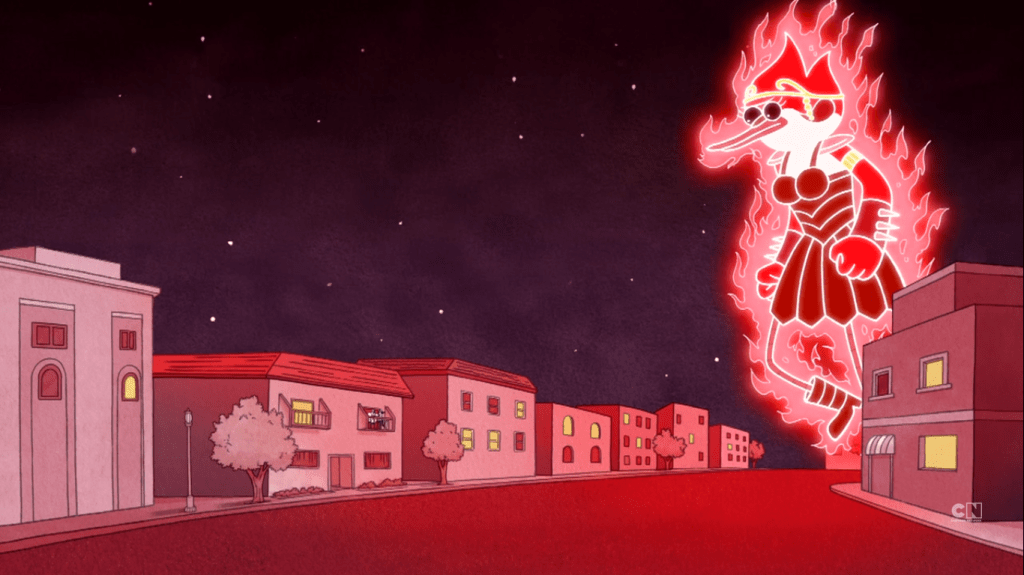 What else happens in season 2? Rigby dies twice, recurring characters are introduced like Mr. Maellard, Death, and Starla… I’ll talk more about them later. Another highlight of the season is Grave Sights (2.19) for one reason: it’s extremely hype. Mordecai and Rigby screen a zombie apocalypse movie to the park, but a technology mishap causes zombies to appear from the graveyard. The guys fight zombies in parallel to the events of the movie, and the audience thinks it’s all part of the show. It goes so well that Benson asks Mordecai and Rigby to host the same show tomorrow much to their panic. Though this show is normally saturated with absurd humor, this episode kicks ass without a trace of irony, and I love that. Almost every episode in season 2 has events make something unrealistic happen, and this repeated formula leads season 3 to twist things up a bit.